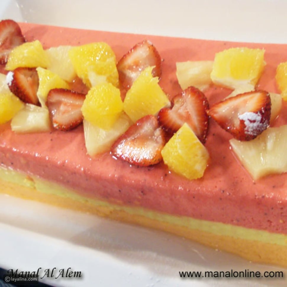 8. للتقديم: مرّري سكين عريضة بين حواف القالب والجيلي لتبعديه عن القالب، ضعيه في ماء ساخن لمدة 10 ثواني فقط، حرّكي القالب قليلا لتخلّصي حلى الجيلي من القالب، بحذر شديد إقلبي الحلى على طبق تقديم. زيني بالفواكه الطازجة وانثري قليل من السكر البودرة .قدميه مباشرة.